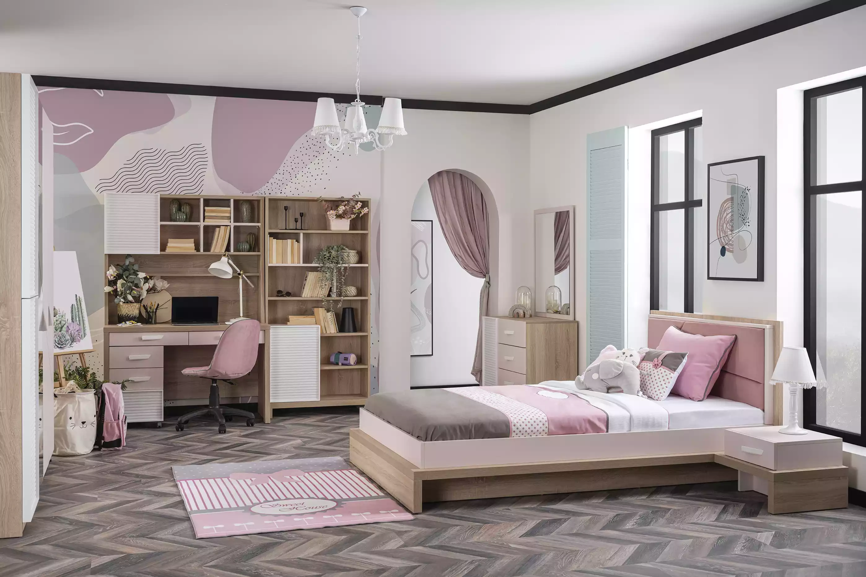 Das Kinderbett Kinderzimmer Bett Holz Rosa Garnitur Kindermöbel Set 9tlg verkörpert zeitlose Eleganz und außergewöhnliche Handwerkskunst. Aus hochwertigem Holz gefertigt, strahlt es eine subtile Raffinesse aus, die jedes Kinderzimmer in eine Oase des Wohlbefindens verwandelt. Die sanfte Rosatönung verleiht dem Raum eine einladende Wärme und harmoniert perfekt mit einer Vielzahl von Einrichtungsstilen. Mit einem durchdachten Design bietet dieses Set nicht nur Komfort, sondern auch Sicherheit für die Kleinen. Jedes Detail wurde sorgfältig ausgewählt, um die Bedürfnisse des modernen Lebens zu erfüllen und gleichzeitig eine exklusive Atmosphäre zu schaffen. Wählen Sie dieses Kinderbett, um das Zuhause Ihres Kindes mit einem Hauch von Luxus und Stil zu bereichern.