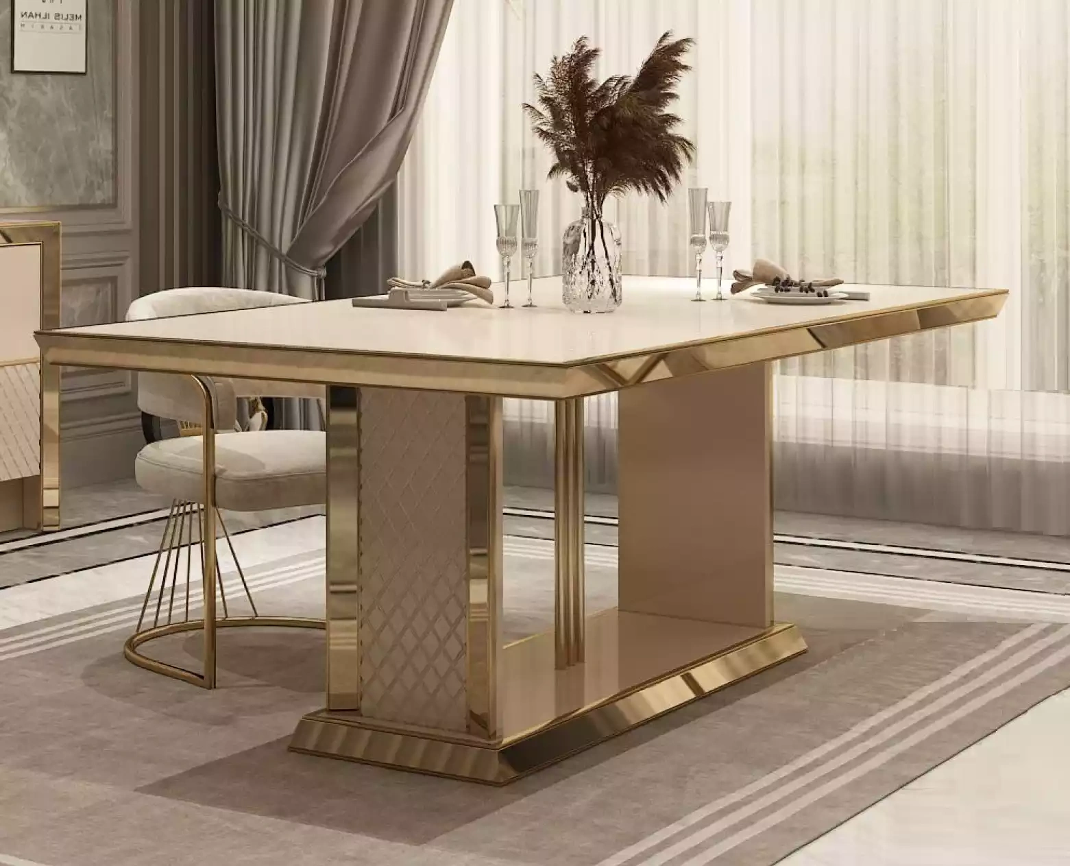 Die Essgruppe Esstisch mit 4 Stühlen ist ein Meisterwerk der modernen Eleganz und Funktionalität. Gefertigt aus hochwertigem, beigem Edelstahl und edlem Holz, verkörpert dieses 5-teilige Set zeitlose Ästhetik und erstklassige Handwerkskunst. Die harmonische Farbgebung fügt sich nahtlos in jede anspruchsvolle Einrichtung ein und schafft eine Atmosphäre von Raffinesse und Stil. Die großzügige Tischfläche bietet ausreichend Platz für gesellige Zusammenkünfte, während die ergonomisch gestalteten Stühle höchsten Sitzkomfort garantieren. Jedes Element dieser Essgruppe spiegelt das Engagement der Marke wider, Luxusmöbel von unvergleichlicher Qualität zu schaffen. Setzen Sie ein Zeichen für einen exklusiven Lebensstil und verwandeln Sie Ihr Esszimmer in einen Ort der Geselligkeit und des Genusses.