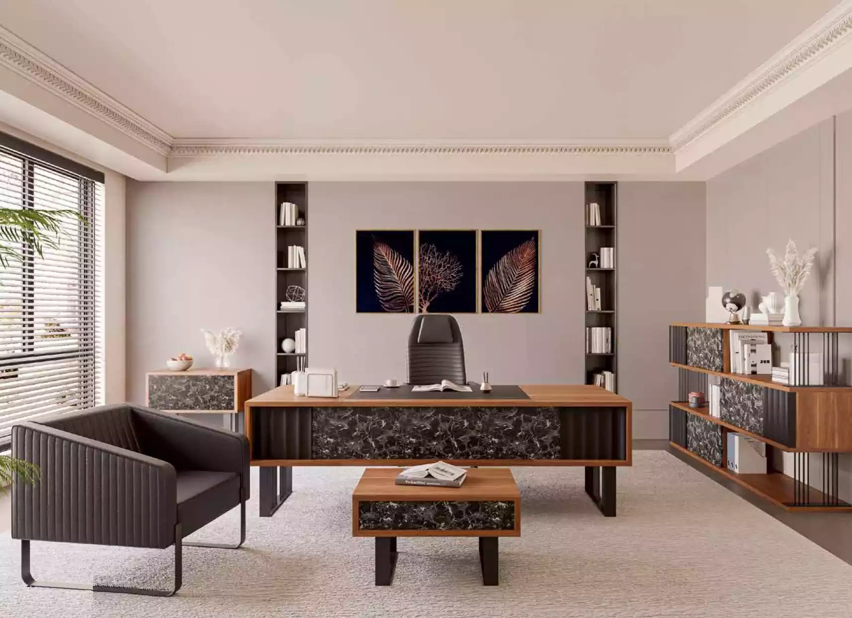 Das moderne Arbeitszimmermöbel Büro Set vereint Funktionalität und zeitlose Eleganz in einem harmonischen Ensemble. Der exquisite Schreibtisch, gefertigt aus erlesenem braunem Holz, bietet nicht nur ausreichend Platz für kreative Entfaltung, sondern strahlt auch eine ruhige Autorität aus. Der dazu passende Couchtisch ergänzt das Gesamtbild und schafft eine stilvolle Verbindung zwischen Arbeits- und Wohnbereich. Der Aktenschrank, designt für höchste Ansprüche, vereint Ordnung und Ästhetik und sorgt für eine klare, aufgeräumte Atmosphäre. Jedes Element dieses Sets ist ein Zeugnis für 20 Jahre Erfahrung in der Herstellung luxuriöser Möbel und verkörpert den perfekten Lebensstil für anspruchsvolle Genießer.