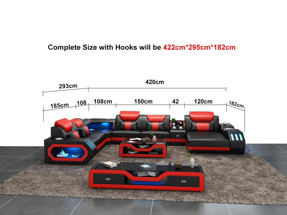 Möchten Sie Ihr Wohnzimmer mit einem modernen und geräumigen Design-Sofa aufwerten? Dann ist das Design Big Sofa mit USB Ecksofa Couch Wohlandschaft U Form Leder Textil Ecke genau das Richtige für Sie! Dieses Ecksofa in U-Form bietet nicht nur genügend Platz zum Entspannen, sondern auch praktische USB-Anschlüsse für Ihre elektronischen Geräte. Das Ecksofa hat beeindruckende Maße von ca. 295 x 422 x 182 cm und überzeugt mit einer Höhe von ca. 105 cm sowie einer komfortablen Sitzhöhe von ca. 42 cm. Dank des hochwertigen Premium Lederfaserstoffs (70% Leder / 30% Polyester) ist das Sofa nicht nur gemütlich, sondern auch pflegeleicht. Sie haben die freie Farbwahl, um das Sofa ganz nach Ihrem Geschmack zu gestalten. Zudem können Sie zwischen verschiedenen Material- und Tuning-Optionen wählen, darunter Premium Echtleder, Premium Textilstoff und Premium Vollleder. Optional können Sie auch eine elektrische Relax-Fußstütze, ein Soundsystem über Bluetooth oder eine Unterbodenbeleuchtung mit Fernbedienung in Farbwechsel dazu bestellen. Erwecken Sie Ihr Wohnzimmer neu zum Leben und gönnen Sie sich dieses exklusive Design-Sofa, das nicht nur elegant aussieht, sondern auch höchsten Komfort bietet. Lassen Sie sich von der XL Möbel Qualität überzeugen und bestellen Sie Ihr Design Big Sofa mit USB jetzt!