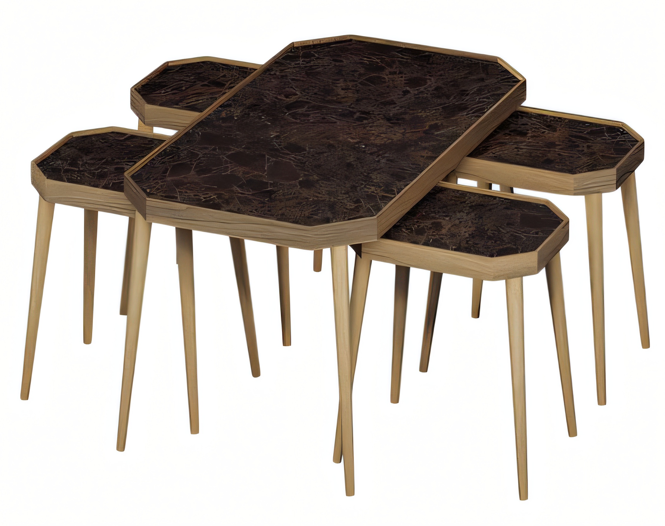 Der elegante braune Holz-Couchtisch mit Beistelltischen vereint zeitlose Ästhetik und moderne Funktionalität. Aus erlesenem Holz gefertigt, strahlt er eine warme Eleganz aus, die jeden Wohnraum bereichert. Die harmonische Farbgebung in sattem Braun fügt sich nahtlos in edle Interieurs ein und schafft eine Atmosphäre von Raffinesse und Stil. Die geschickte Kombination aus Haupttisch und Beistelltischen bietet nicht nur praktische Anordnungsmöglichkeiten, sondern setzt auch stilvolle Akzente. Jedes Detail zeugt von handwerklicher Perfektion und einem hohen Anspruch an Qualität. Dieser Couchtisch ist nicht nur ein Möbelstück, sondern ein Statement für ein exklusives Lebensgefühl, das Ihre Einrichtung auf ein neues Niveau hebt. Wählen Sie ihn, um Ihren Raum mit einem Hauch von Luxus zu veredeln.
