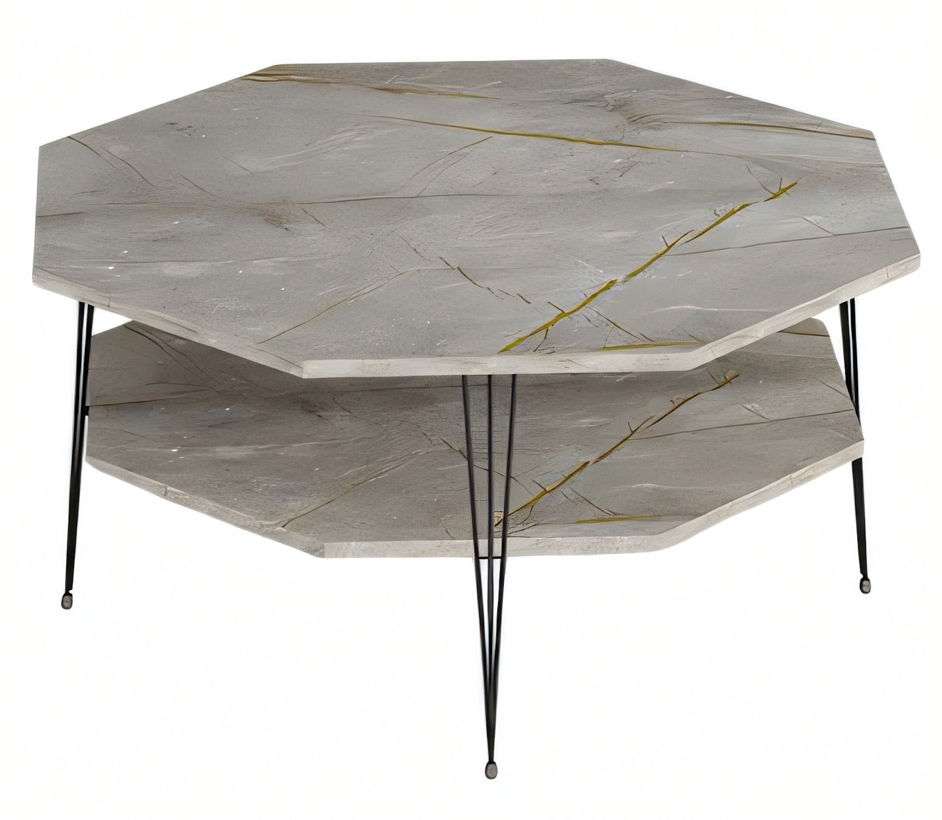 Moderner grauer Couchtisch aus Holz mit Edelstahlrahmen
