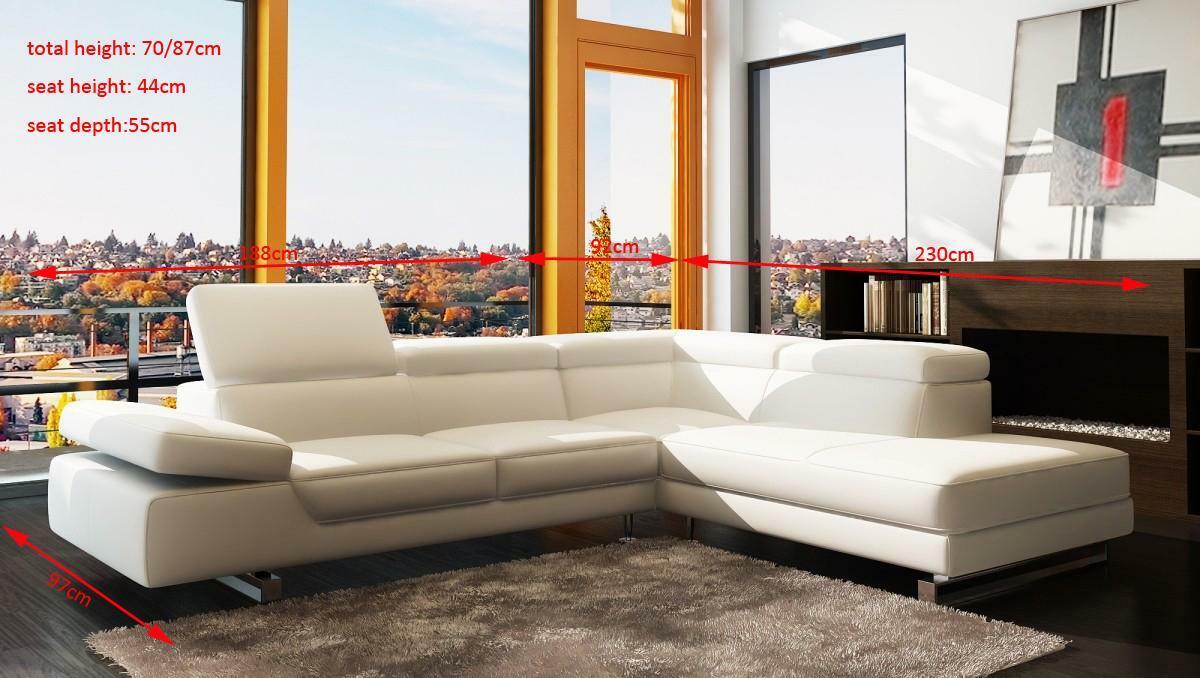 Erwerben Sie die perfekte Ergänzung für Ihr Zuhause mit dem Ecksofa Ledersofa Wohnlandschaft L Form! Mit Maßen von ca. 230 x 280 cm oder 280 x 230 cm bietet dieses Sofa nicht nur Komfort, sondern auch Stil. Die Sitzhöhe von ca. 44 cm und die Sitztiefe von ca. 55 cm sorgen für eine gemütliche Atmosphäre in Ihrem Wohnzimmer. Das Ecksofa ist mit Premium Lederfaserstoff (70% Leder / 30% Polyester) bezogen, und Sie haben die Möglichkeit, zwischen verschiedenen Materialoptionen zu wählen. Entscheiden Sie sich zwischen Premium Echtleder, Premium Textilstoff oder Premium Vollleder (Aufpreis auf Anfrage). Mit einer Vielzahl von Farben zur Auswahl, darunter Zyan, Amethyst, Schwarz und Weiß, können Sie sicher sein, dass dieses Sofa zu Ihrer Einrichtung passt. Das Ecksofa verfügt über ein Innengestell aus echtem Holz für Stabilität und Langlebigkeit. Schaffen Sie mit dieser hochwertigen Wohnlandschaft den perfekten Ort zum Entspannen und Wohlfühlen in Ihrem Zuhause. Sichern Sie sich jetzt dieses elegante Leder-Ecksofa und verwandeln Sie Ihr Wohnzimmer in eine stilvolle Oase!