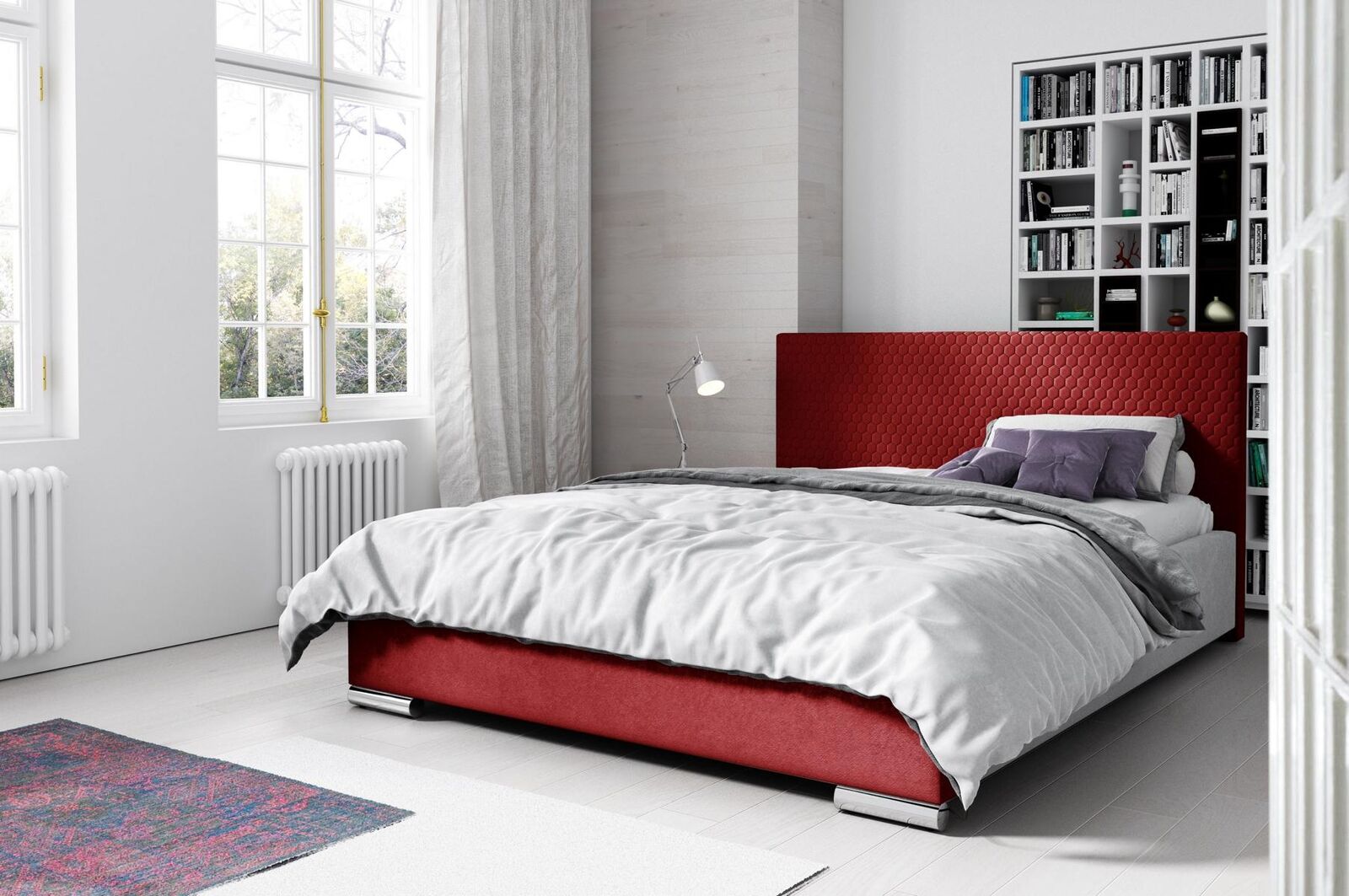 Entdecken Sie unser modernes Doppelbett in Rot von XL Moebel! Mit einer Liegefläche von ca. 180 x 200 cm bietet dieses Ehebett aus Polyester viel Platz zum Entspannen und Schlafen. Der Bettrahmen ist ca. 198 cm breit, 222 cm lang und ca. 92 cm hoch, mit einer geraden, gesteppten Kopfstütze, die auf 3 cm Schaumstoff gepolstert ist. Der Metallrahmen verfügt über 34 belastbare und flexible Lamellen sowie die Möglichkeit, zwischen verschiedenen Fußoptionen wie weiß, chrom, sonoma oder wenge zu wählen. Optional sind verschiedene Liegeflächenmaße verfügbar, sowie eine Auswahl an Stoff- oder Premium-Kunstleder in verschiedenen Farbgruppen. Der Lieferumfang umfasst das Bett, aber Sie haben auch die Möglichkeit, gegen Aufpreis einen Bettkasten oder eine Matratze hinzuzufügen. Perfekt für ein modernes Schlafzimmer! Holen Sie sich jetzt Ihr neues Polsterbett für entspannte Nächte!