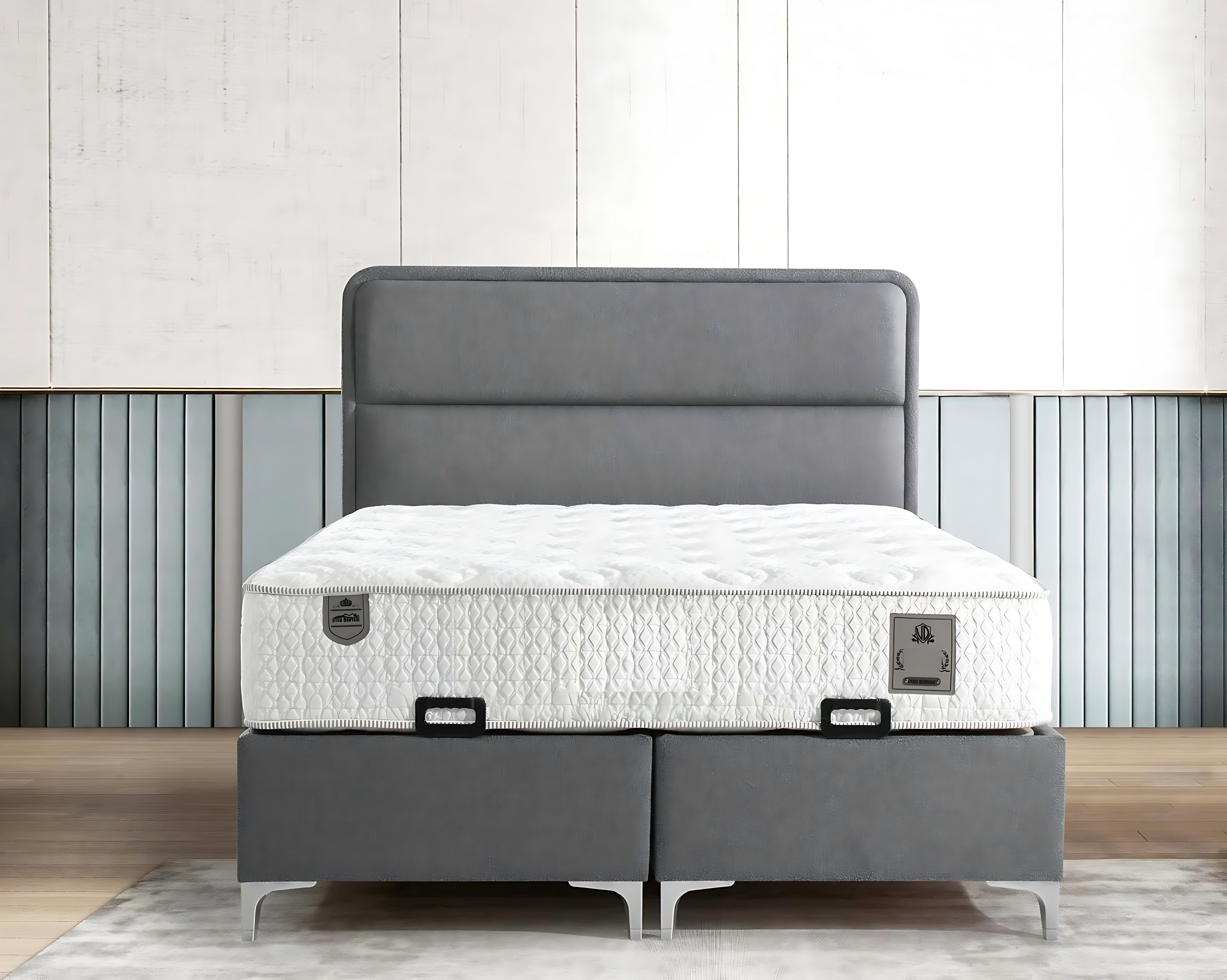 Modernes graues Bett mit Matratze aus Textil und Holz | xlmoebel.de