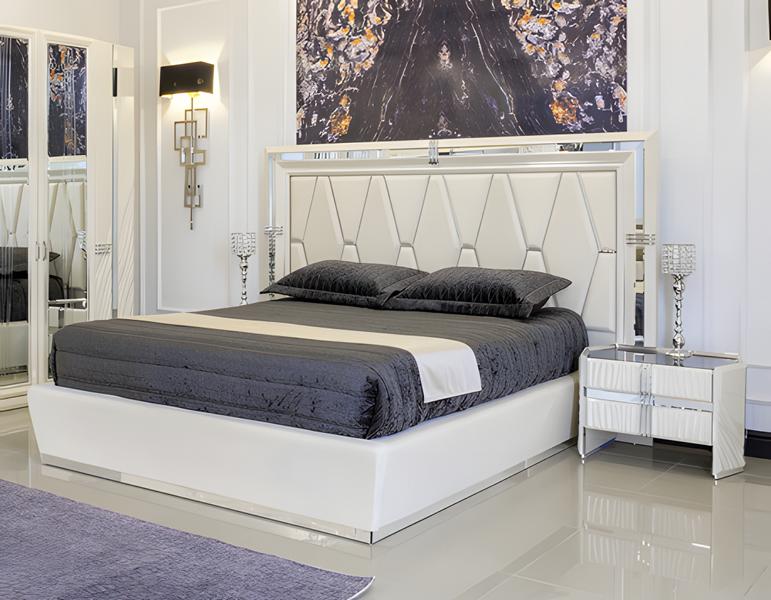 Das 4-teilige moderne Möbelset 'Schlafzimmer Set Bett + 2x Nachttische + Kleiderschrank' ist die perfekte Wahl für ein stilvolles Schlafzimmer. Das Set umfasst ein elegantes Bett mit den Maßen ca. 230 x 149,5 x 218,7 cm, 2 geräumige Nachttische mit jeweils ca. 86,4 x 46,2 x 145 cm und einen großzügigen Kleiderschrank mit den Maßen ca. 267,5 x 67,3 x 209 cm. Die Liegefläche des Bettes beträgt ca. 180 x 200 cm, was für erholsame Nächte sorgt. Hergestellt aus hochwertigem Holz, Textil und Metall in der zeitlosen Farbe Weiß, bietet dieses Set Funktionalität und Eleganz zugleich.