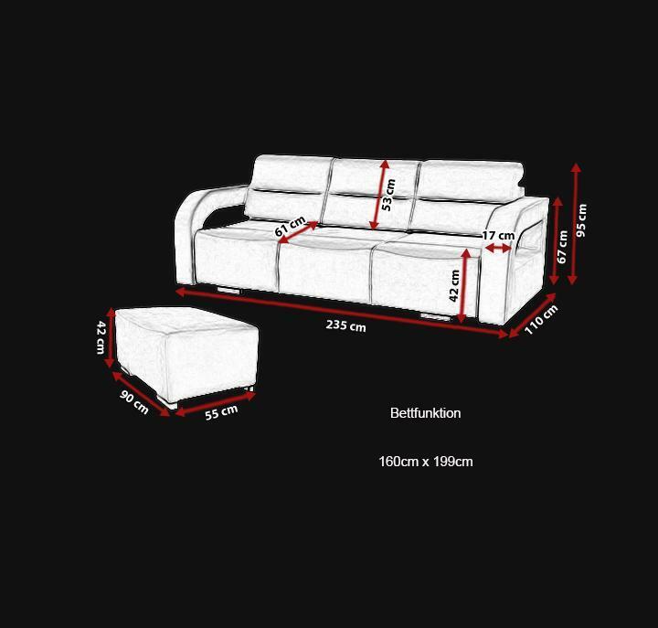 Entdecken Sie das Schlafsofa Klappcouch 3-Sitzer von XL Möbel! Dieses Klappsofa mit Schlaffunktion und Bettkasten ist nicht nur funktional, sondern auch ein echter Hingucker in Ihrem Zuhause. Mit Maßen von ca. 235 x 110 cm oder 160 x 199 cm bietet es ausreichend Platz zum Entspannen. Das Highlight dieses Sofas ist die freie Farbwahl - von frischem Moosgrün über elegantes Marineblau bis hin zu trendigem Avocadogrün. Zudem können Sie das Material nach Ihren Wünschen auswählen. Entscheiden Sie sich zwischen Stoff oder Premium Kunstleder in verschiedenen Gruppen. Die Schlaffunktion bietet eine Liegefläche von ca. 160 x 199 cm, perfekt für Gäste oder gemütliche Filmabende. Der integrierte Bettkasten sorgt für zusätzlichen Stauraum und der inkludierte Hocker rundet das Set ab. Dieses 3-Sitzer Schlafsofa überzeugt nicht nur mit seinem Design, sondern auch mit Qualität - das Innengestell aus echtem Holz und Federkern sorgen für Komfort und Langlebigkeit. Holen Sie sich dieses praktische und stilvolle Möbelstück in Ihre vier Wände und machen Sie es sich gemütlich!