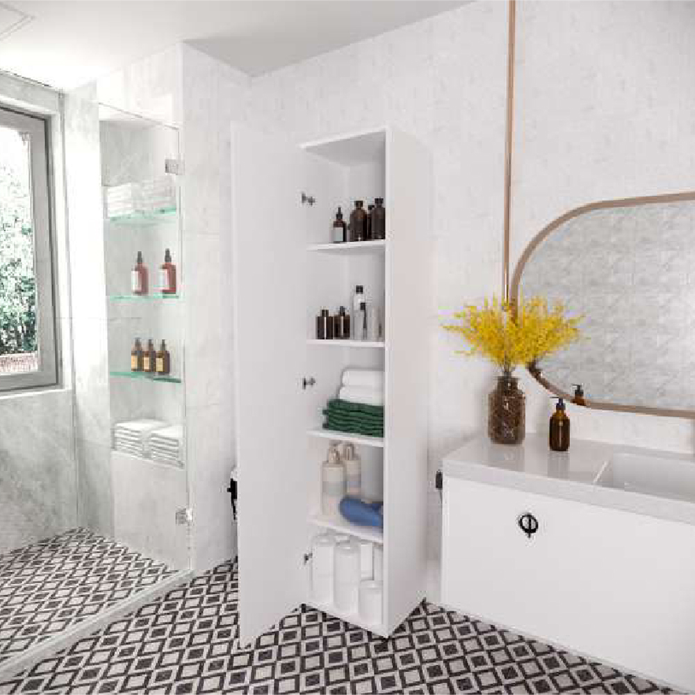 Der Badezimmerschrank in Weiß ist ein modernes und luxuriöses Möbelstück, das Ihr Badezimmer stilvoll ergänzt. Mit Maßen von ca. 40 x 33 x 171 cm bietet dieser rechteckige Badschrank aus Holz ausreichend Stauraum für Ihre Badutensilien. Die elegante Farbe und das schlichte Design machen ihn zu einem zeitlosen und vielseitigen Einrichtungsgegenstand.