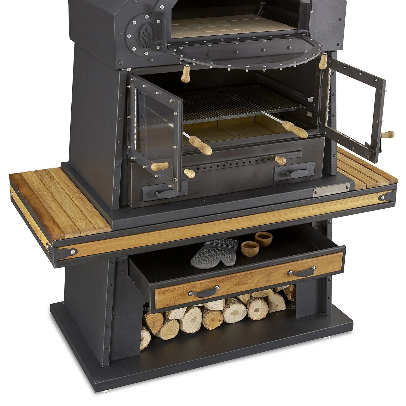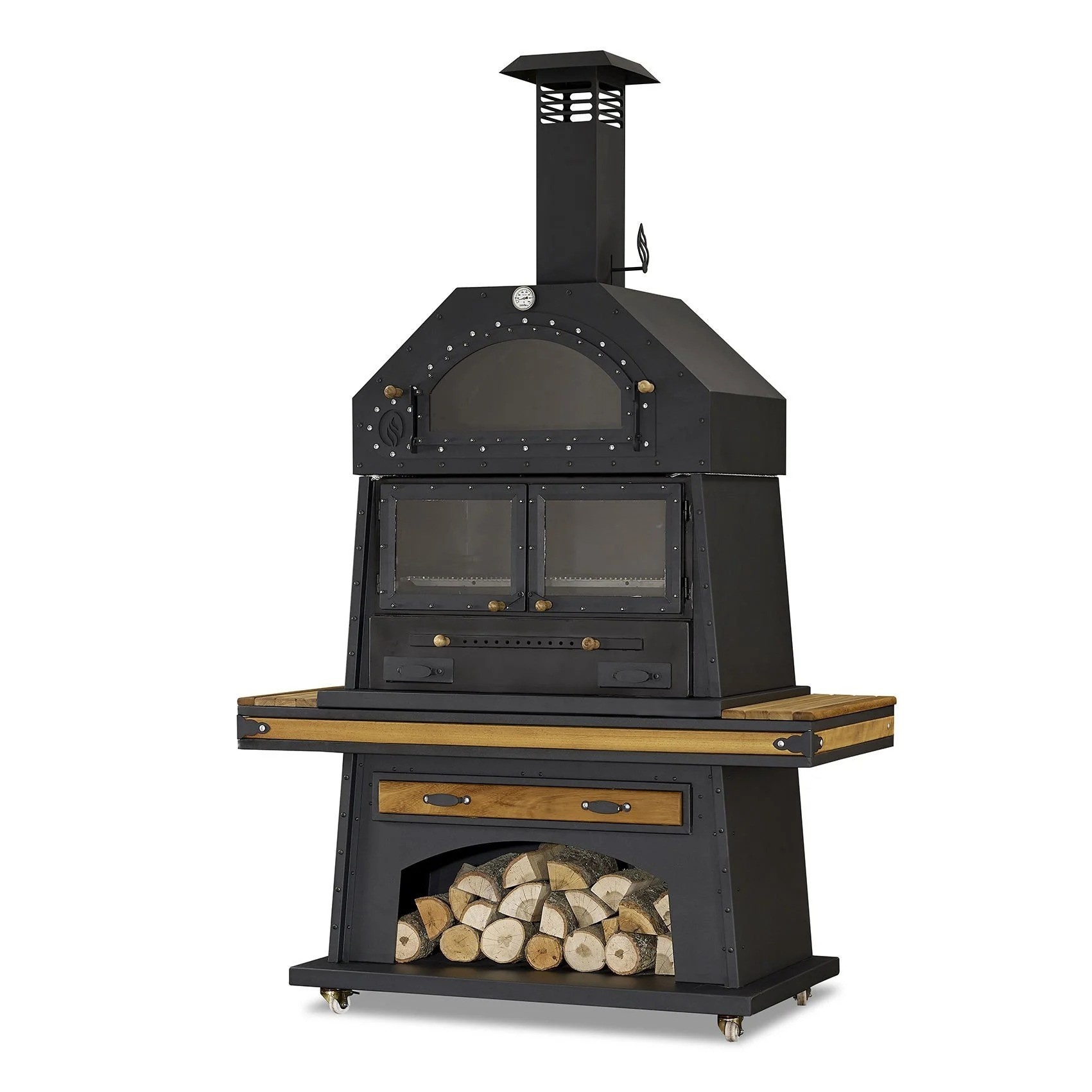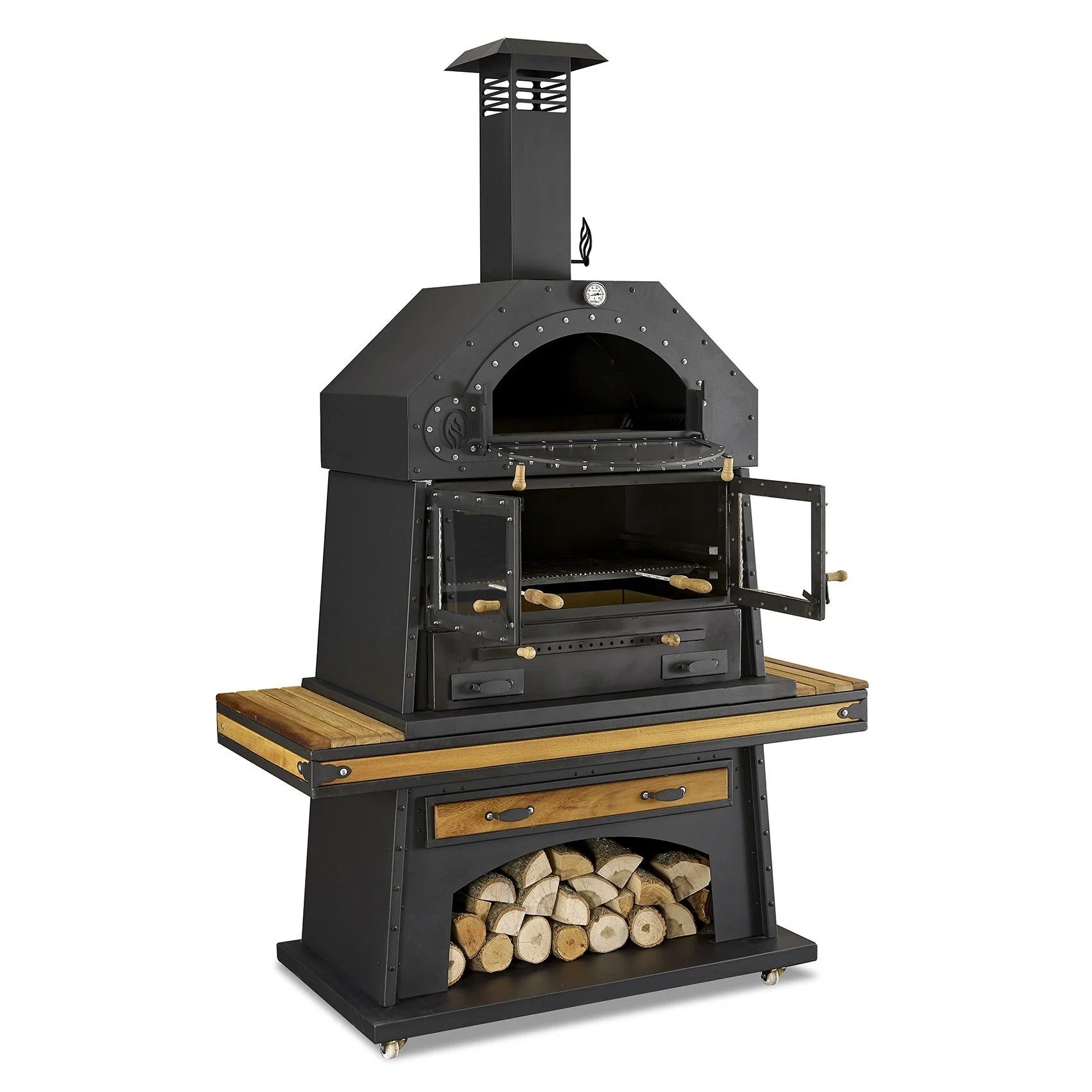 Eleganter schwarzer Grillkamin aus Holz und Edelstahl | xlmoebel.de