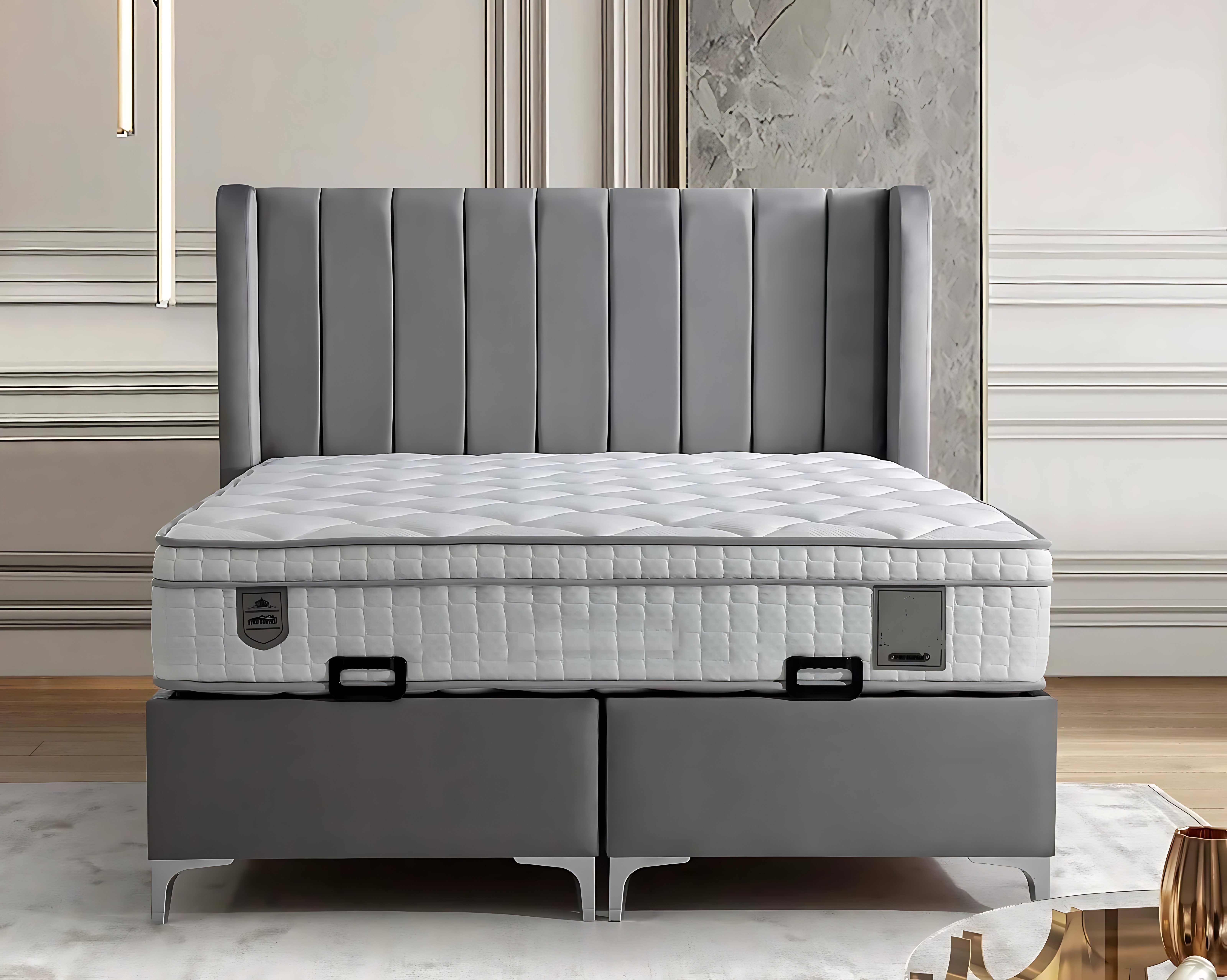 Entdecken Sie das elegante graue Bett, das sich harmonisch in jede exklusive Umgebung einfügt. Die Kombination aus hochwertigem Textil und edlem Holz verleiht diesem Möbelstück nicht nur eine zeitlose Ästhetik, sondern auch unübertroffene Stabilität und Komfort. Der sanfte Grauton strahlt Ruhe und Eleganz aus, während die sorgfältige Verarbeitung für eine Langlebigkeit sorgt, die den Ansprüchen eines gehobenen Lebensstils gerecht wird. Die maßgefertigte Matratze garantiert erholsamen Schlaf und unterstützt Ihre individuellen Bedürfnisse. Dieses Bett ist mehr als nur ein Möbelstück; es ist ein Statement für Stilbewusstsein und Klasse, das Ihre Wohnräume zu einem Rückzugsort der Extraklasse erhebt.