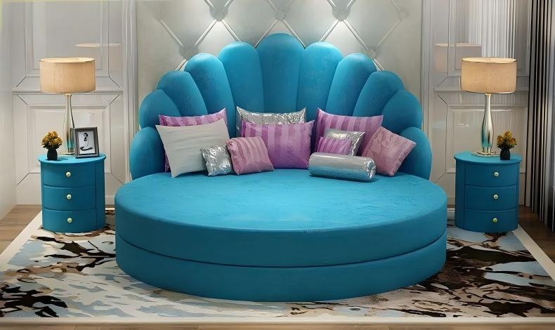 Elegantes Rundbett Weiß Shell Design Polster Lila Silber Modernes Schlafzimmer | xlmoebel.de